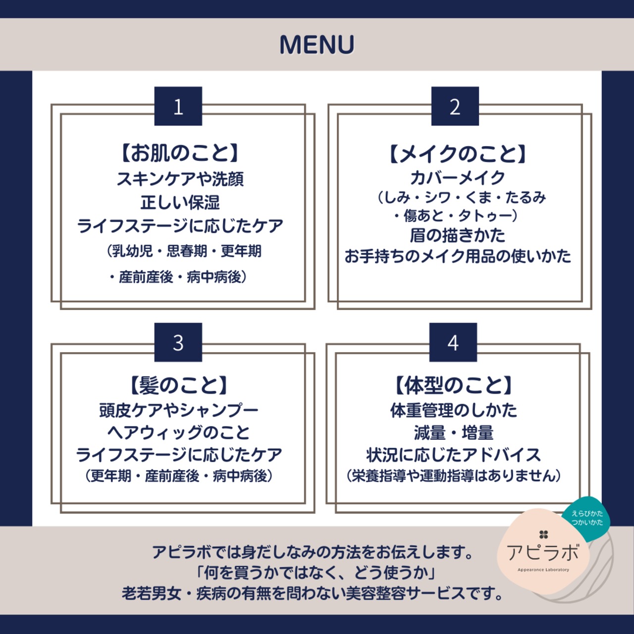 MENU表より、あらかじめおおよそのご相談内容を選んでいただけますとスムーズです。